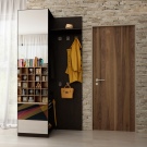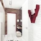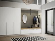 Noteworthy here is a full-length mirror, which is also convenient because it visually expands the boundaries of space. It is assumed that only actual outerwear is hanging on the hanger, everything else is in other cabinets and dressing rooms. The fusion of colors also helps to make the small area appear more spacious.