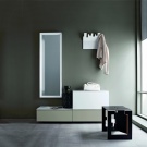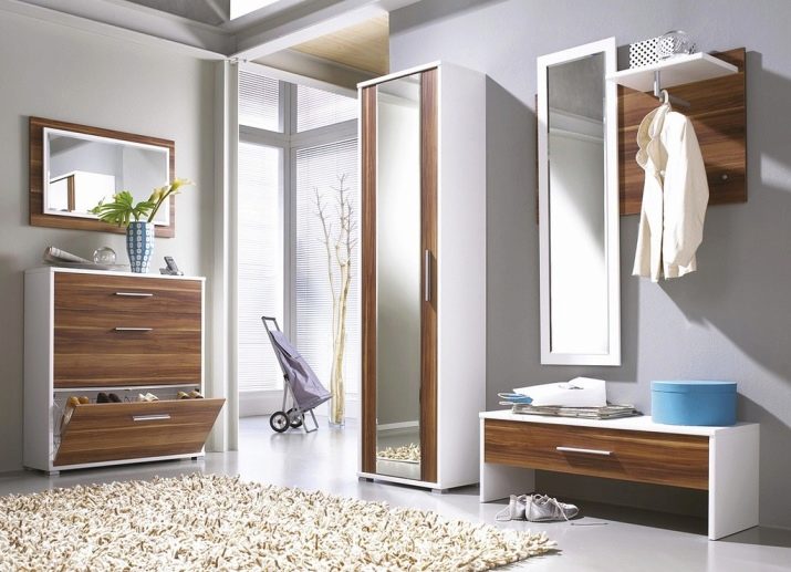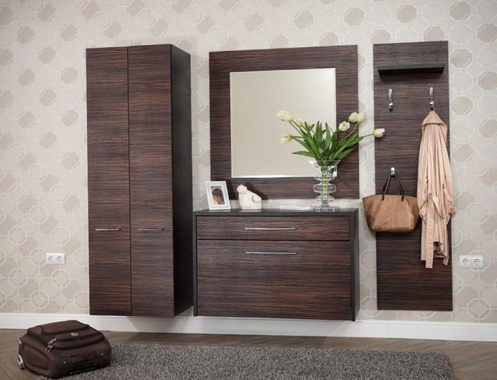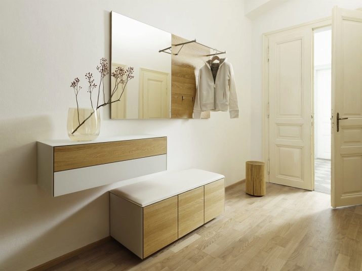 - hanging chest of drawers plus mirror: hanging structures always visually lighten the interior, make it more airy; a light chest of drawers with a small neat mirror will be interesting to look in in a small hallway;