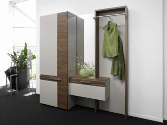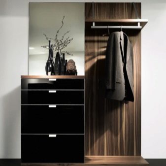 An option that shows a modern solution to the coat rack and dresser in the hallway. The hanger itself is decorative, but without frills, it gives dynamics to the space. The chest of drawers is hinged, and it is a very roomy design. There is additional storage space inside the canapes.