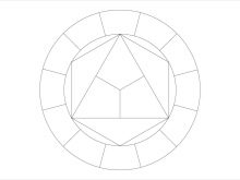 Having determined the vertices of the triangle, they are used as points for drawing the contours of the circle. According to them, the internal figure is extended to a hexagon, determining the location of additional second-order colors (orange, green, purple). Outside the already drawn radius, a second one is lined up, at a certain distance, centered at the same point. The resulting line is divided into 12 equal parts.