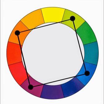 The quadrangle inscribed in Itten's circle shows how you can combine four tones in clothes at once. The locations of its corners are the points that determine successful color combinations. As a rule, the final solution is quite bright, but you can balance it by focusing on the red-green gamut of shades.