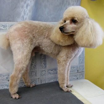 As a rule, such a haircut is done by poodles who participate in dog shows. No hair is left on the face. On the head and ears they are trimmed and combed a little, giving a large volume. Then proceed to the design of the torso. Here, the cover can be slightly trimmed, it is not necessary to shave the limbs, by the end they can make a small oval seal of wool. The tail start is shaved. Its end is made round or give it a little oval shape. If necessary, the cover can be slightly trimmed with scissors.