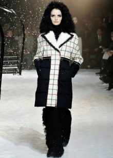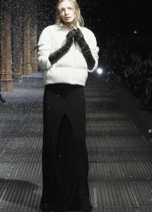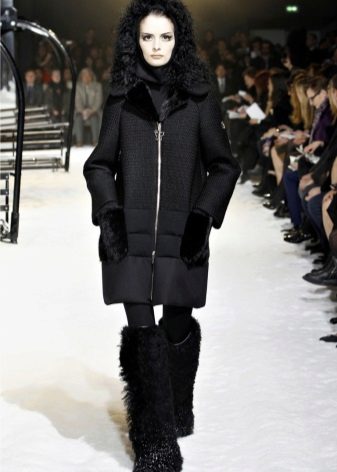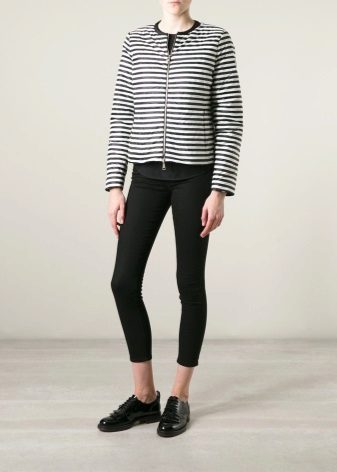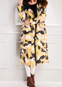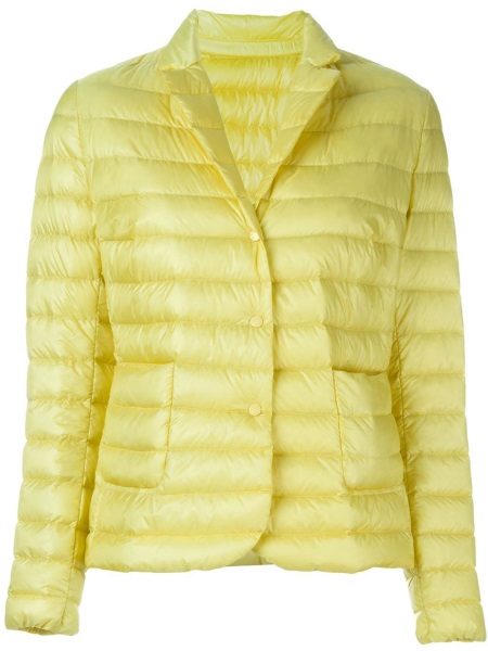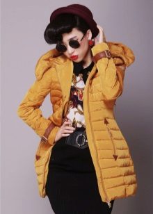 The jacket of a lemon yellow color of medium length resembles, rather, an insulated jacket, thanks to a turn-down collar, patch pockets and narrowed sleeves. The model is made of quilted material, so it is not only elegant, but also very warm.