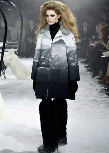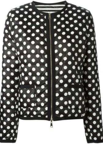 A short down jacket in monochrome colors attracts attention with its unusual design - after all, these are two things in one. A down jacket can be worn by turning it inside out: a strict strip turns into playful peas.
