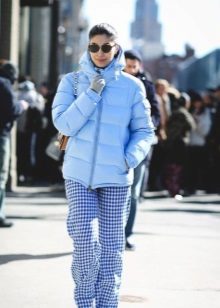 Jessica Hart in a voluminous down jacket in a combined color with a hem and ankle boots.