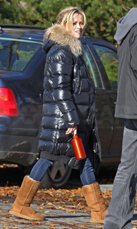 - Reese Witherspoon in a loose black down jacket with a fur-trimmed hood, blue jeans and warm uggs.