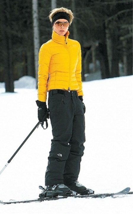 - Victoria Beckham is known for her passion for sports: she wears a cropped down jacket in bright yellow with black ski pants.