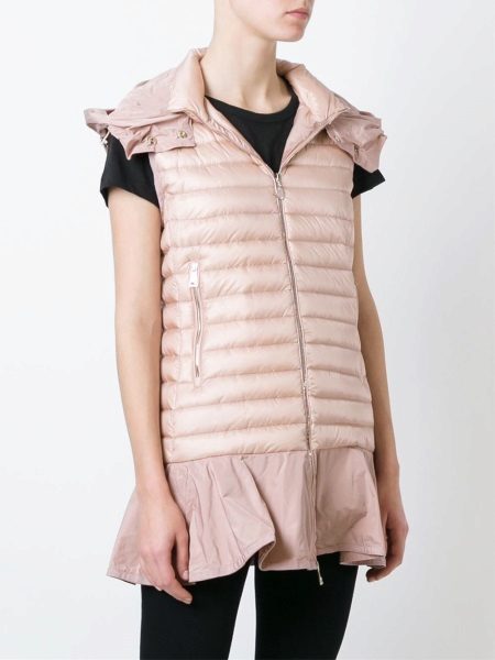 Extra long down jacket in delicate pink color without sleeves with a removable hood. The flirty hem trim in the form of a skirt gives the sports model a touch of romance.