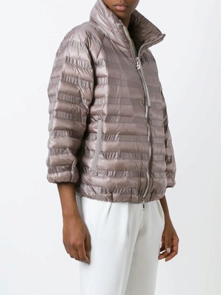 Oversized pearl down jacket with high collar and ¾ sleeve. The original stitch creates a horizontal stripes pattern on the fabric. This sports model will appeal to those who adhere to an active lifestyle.