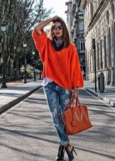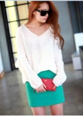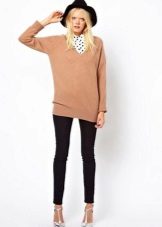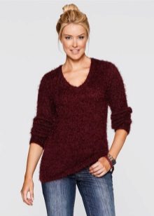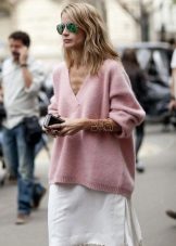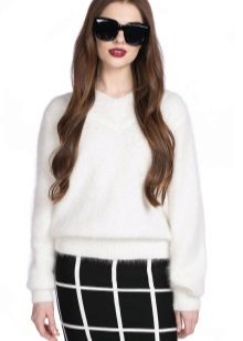 Voluminous, fluffy pullovers made of wool, Angora, mohair or other warm materials combine perfectly with tight trousers, tight-fitting jeans or leggings, straight-cut shorts and skirts. If you choose a voluminous bottom for such a pullover, for example, a fluffy skirt, then the figure will seem very massive and squat.
