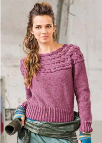 The coquette always favorably emphasizes your neck and decollete. A pullover with a yoke from braids is a great option for a warm autumn. Combine such a pullover with an elegant hat or beret.