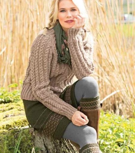 It is easy to create a casual look with a beige pullover and a knitted skirt that combines with warmed leg warmers. The image is very cozy and warm in the autumn.
