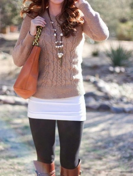 Wear a dark beige pullover with an extended T-shirt on an autumn sunny day. Brown boots and a bag will make a great duo for your braid pullover. Finish your look with white boho beads.