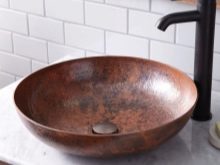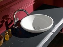 Today, overhead sinks for bathrooms can be made in a variety of and fancy design options. Some models of sinks will look good only in a certain style, while others (for example, standard oval or rectangular white sinks) are universal and fit perfectly into any design.
