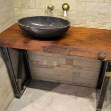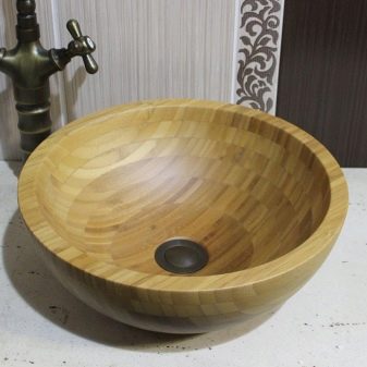 - Wood. Natural bamboo, oak or teak are commonly used to create wood sinks. Such models are rare in the design of standard apartments - all because of the low resistance of wooden components to moisture and a constant high level of humidity. This is not a very practical (albeit original) choice for the bathroom, as these models will require careful care and treatment with special oils to prevent moisture from entering the pores of the wood.