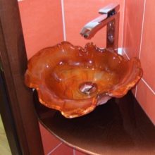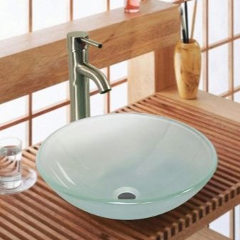 - Glass. Glass sink - an original and interesting from a design point of view, a choice that can look good in many style decisions. Shells can be made of glass in the most bizarre shapes and designs, which puts them much higher than sinks made of other materials. The minus of the glass is obvious - every drop of water is perfectly visible on it, which dries out over time and leaves ugly white stains.