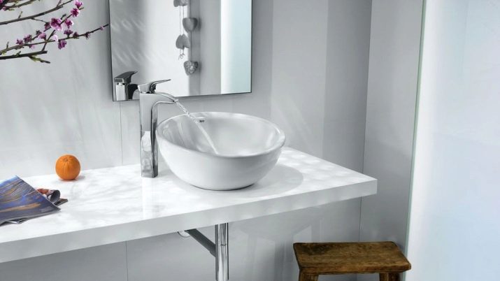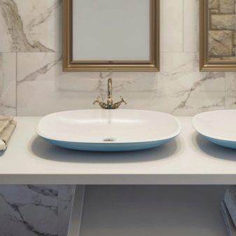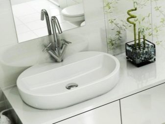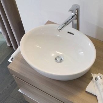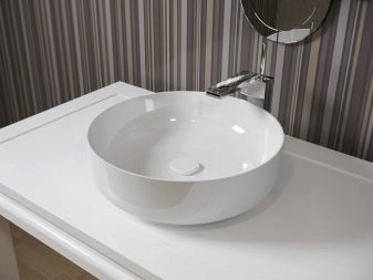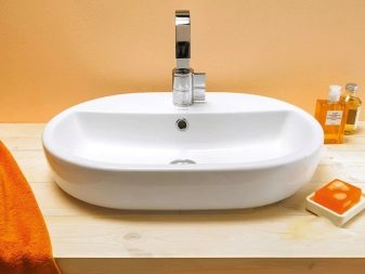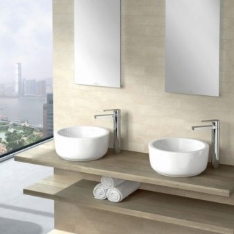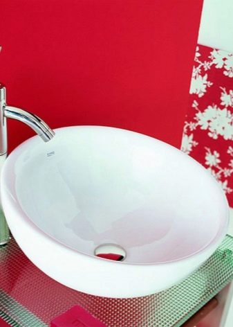 Today, overhead sinks on bathroom countertops can be performed from virtually any material with high strength. On the shelves of plumbing stores you can find models from metal, ceramics, natural stone, wood and even glass. However, the most popular raw material for the manufacture of surface models of sinks in the bathroom remains sanitary porcelain and sanitary ware.
