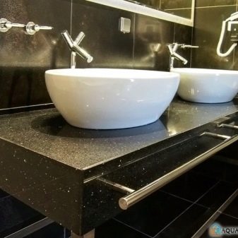 - Natural or artificial stone. Here most often there are products made from natural porcelain, marble, granite, models from stone chips or unusual minerals. Such sinks look extremely unusual in the design of the bathroom due to its texture and original color, but as a minus they have a lot of weight, which forces the installation of countertops with a more rigid mount.