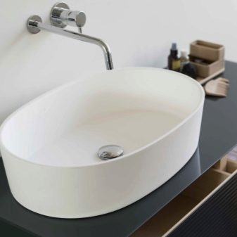 The minus of oval sinks is that they look good only in large and spacious bathrooms, and also that their elongated shape requires an elongated tabletop.