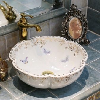 - Classic. For a bathroom made in a classic style, oval or rectangular models of false sinks in white, wheat or cream color are best suited. The main requirement for such sinks is a rich appearance, which can be achieved through the use of gilded faucets or sinks.