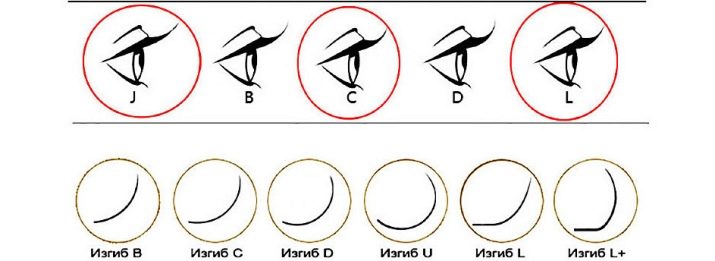 Curves of eyelashes are marked with the corresponding letters, depending on their curl.