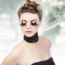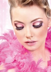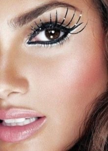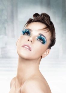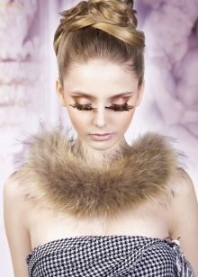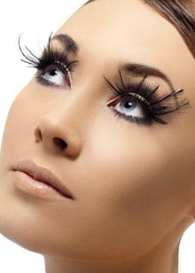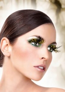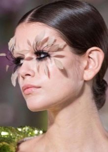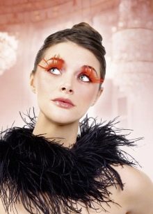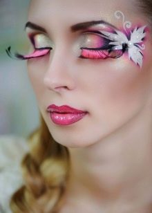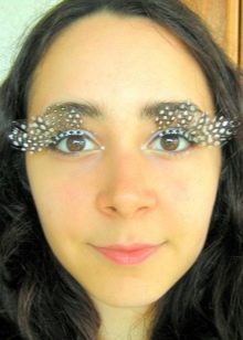 For decorating eyelashes can also be used. miniature flowers, butterflies, feathers and even special ribbons. Usually a massive decor of eyelashes with an abundance of shine, rhinestones and feathers is done if a photo shoot or fashion show is planned. Images with huge eyelashes and feathers look very original and extravagant.