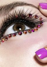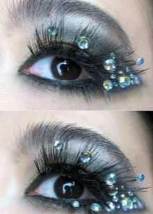 Rhinestones present on cilia, built up using various techniques, is one of the most original and popular trends in the field of evening makeup. To make the look spectacular and aesthetic, it is important to follow one main rule - you need to learn how to correctly select the right stones for the planned decoration, give proper attention to their color, shape, texture, size and total quantity.