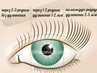 - The middle part is located above the "iris" - it also needs to be divided in two (the pupil will become the "border"). Part from the end of the outer zone to the pupil is filled with artificial material through 1-2 natural eyelashes, part from the pupil to the inner zone - after 3-4.