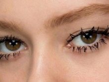 First, you need to apply beige shadows on your eyelids. They are an additional protection for the skin, on which mascara is not imprinted, so that the makeup remains beautiful throughout the day. To lengthen the hairs to such an extent, you will need to paint them with mascara from the root to the ends, slightly lifting up. Experts advise to act in a zigzag brush, then the paint will lie well along the entire length.