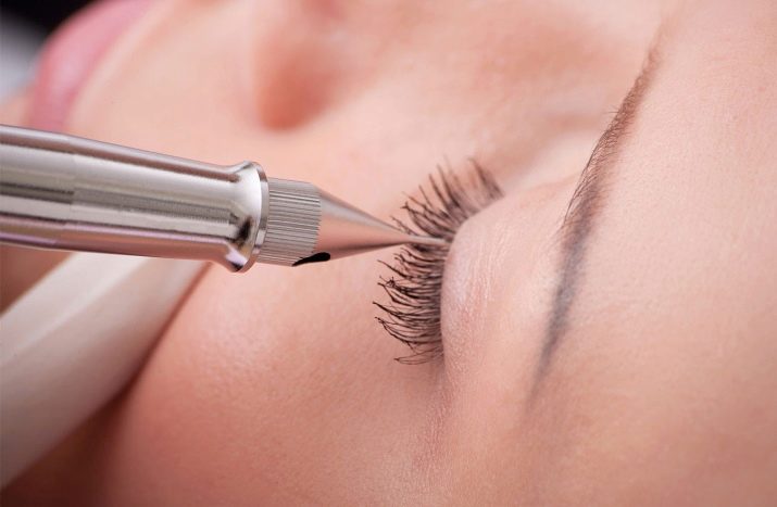 - Then, using a special apparatus with a disposable needle, the master begins to apply pigment between the eyelashes. If “inter-eyelash” is done, then the master does not go beyond the client’s eyelash growth line.