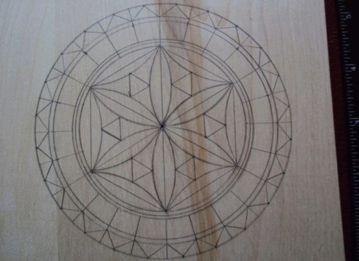 When drawing a sketch, a pencil, ruler and compass are used so that all lines are even and correct. If you can’t create a drawing on your own, you can use the finished sketch by printing it and using an awl of punctures at the intersection of the lines.