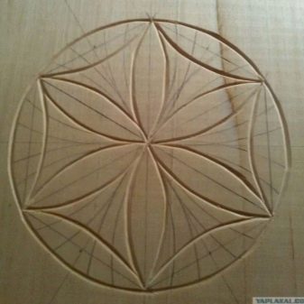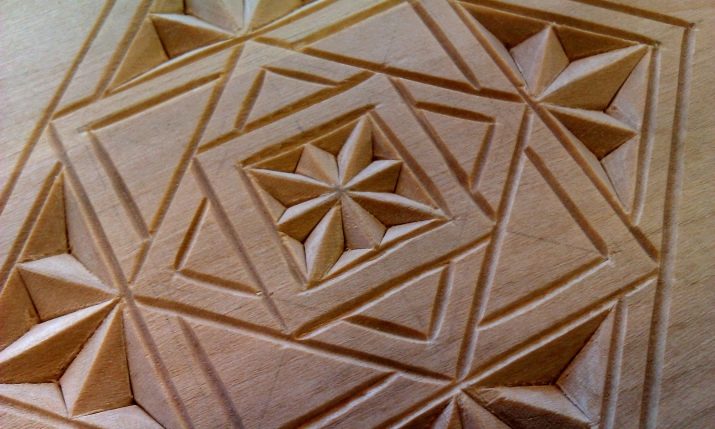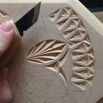 The work takes place by applying several triangles - subject to a certain order and the distance between them. At an equal distance from each other, three triangles are applied, two of which are in the upper part and have a common edge. In the middle between the figures, it will be necessary to designate the point of contact of the corners. The cutting part of the knife should occupy a central position, and movements must be made in the direction in which the natural layers of wood lie.