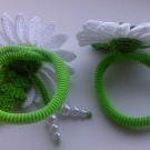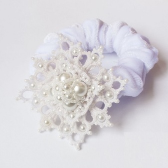 The tatting technique is weaving lace manually. For work, a special shuttle or needles with a blunt end are used. Elastic bands are decorated with ready-made lace elements in the form of snowflakes, flowers, butterflies. Additionally, lace is decorated with rhinestones, beads, beads, sequins.