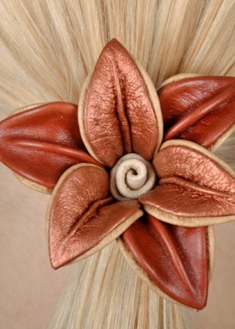 - Gum with leather inserts in the form of flowers are relevant. They go well with a slightly sloppy disheveled tail or pigtail.