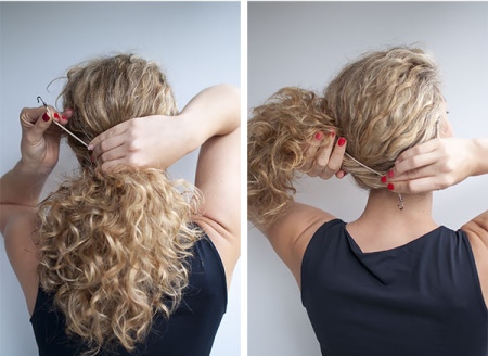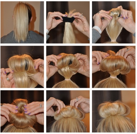 In order to make a neat and uniform bundle, girls use voluminous elastic bands similar to sponges. Using it is very simple: you need to tie a ponytail, and, starting from the ends, wind the hair around the sponge so that it is evenly distributed over it. Then it remains only to fix the finished beam with studs and invisible.