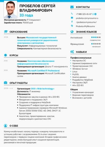 In this paragraph, we consider the most clear and vivid template (example) of a good resume for an IT specialist, which is likely to be accepted by the employer.