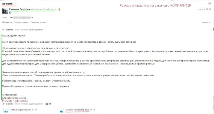 The subject of the message contains information regarding the contents of the letter and the position of interest. The “To” part contains a single email address. Next you see the attached documents, resumes and several copywriting works. In the free body of the letter there is an accompanying text with a brief self-presentation.