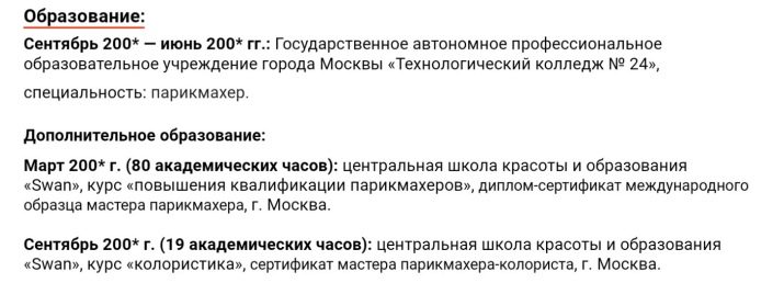 - Inaccurate information. Make sure that the years of study and years of work are indicated correctly, the names of companies and competitions should also be indicated correctly.