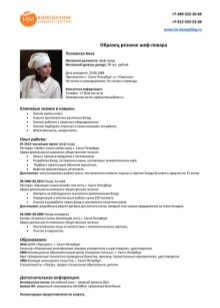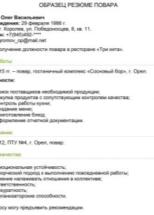 An important part of the resume, in which no mistakes can be made. The applicant applying for a position of a cook must provide about himself at the very beginning of the document correct information namely: F. I. O., address of residence and communication methods, for example, mobile number and e-mail. As additional information, you can specify the address of the page of the social network where photos of ready-made dishes are posted.