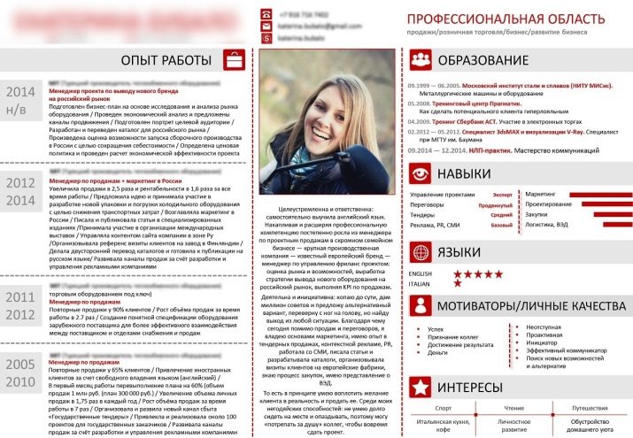 A creative kind of resume involves infographics. In simple words it is a textual self-presentation filled with pictures and other graphic images. Such a resume model not only stands out against the background of ordinary text documents, but also demonstrates the employer's talents.