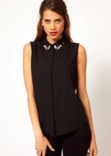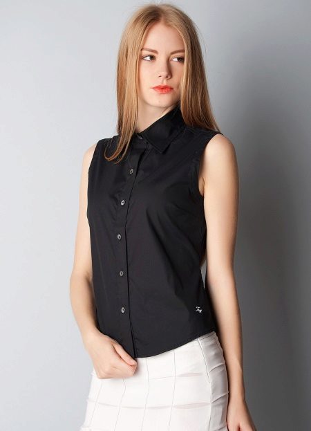 Today the trend is classic sleeveless shirts. The black model looks great in tandem with a white bottom. The length of the blouse can be completely different. Owners of a slender figure can wear models that open the waist.
