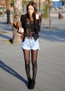 For a hot summer, an excellent solution is a black shirt with a short sleeve of translucent or light fabric and denim shorts.
