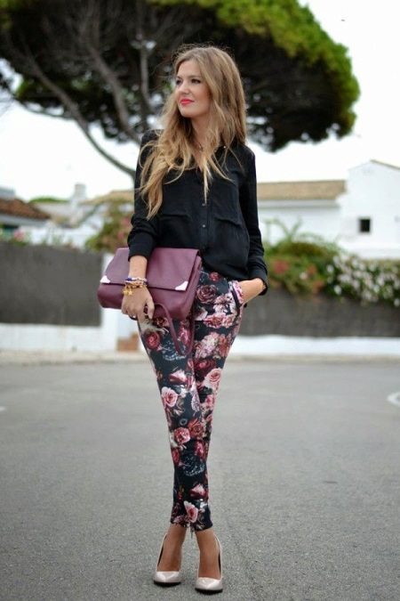 To create a romantic look, the stylish solution will be a black shirt in tandem with trousers decorated with floral prints. Cream or silver stiletto heels will perfectly complement your unique look. A small bag and soft jewelry will add femininity to the silhouette.
