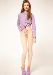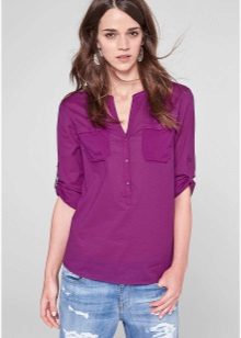 The purple shirt can go well with almost any casual dress: jeans, bright or light trousers, shorts from different fabrics, long or puffy skirts, leather jackets, jeans and cardigans of various styles.