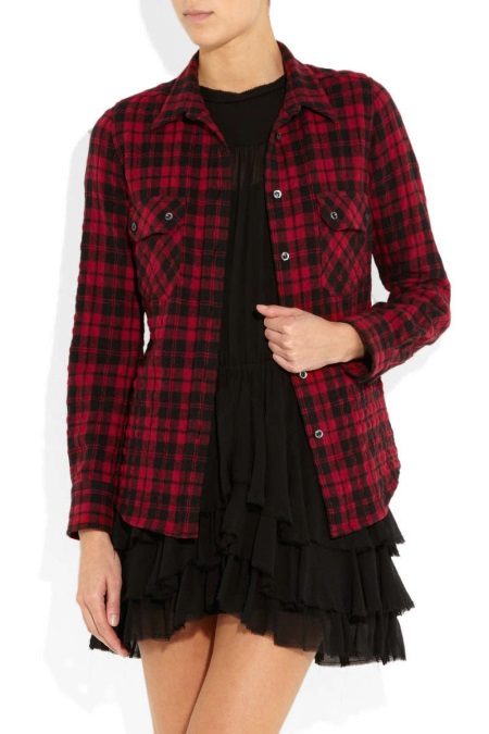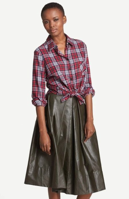 A great example of a combination of a flannel shirt and a flared skirt. To create a more informal image, the sleeves can be rolled up, and the shirt can not be tucked in - tied up over the waistband of the skirt. The trendy gamut used in this outfit makes it indicative of the current season.