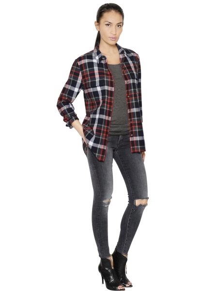The same one is a popular red cage and a wonderful everyday look with no less fashionable ripped jeans.