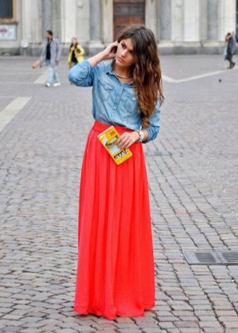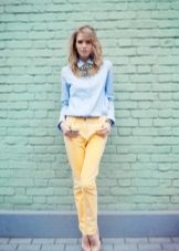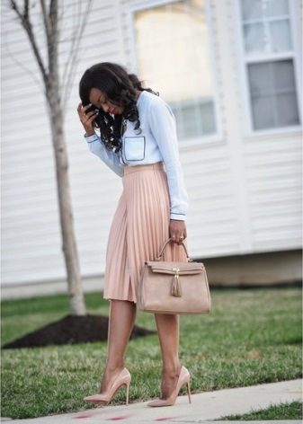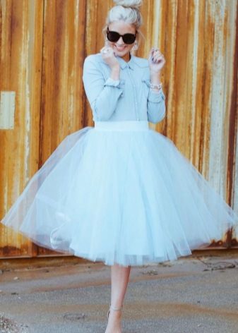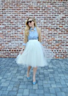 A yellow fluffy skirt and shoes in silver color will help to create a romantic look. A blouse and bag of the same color will complete your look. If desired, put on a bright set of accessories.