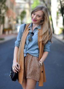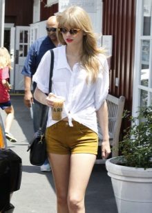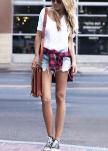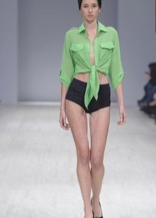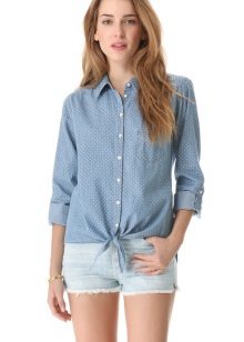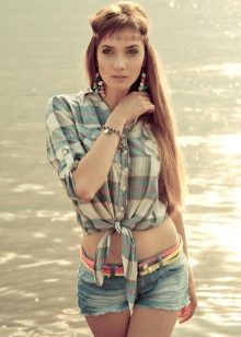 For a combination with shorts, a method of tying a shirt on the hips is well suited. In addition, if the shorts look too short, then the shirt will slightly cover the buttocks. In addition, a shirt tied at the waist would be a good option. A variant with a waist should be avoided, due to excessive vulgarity.