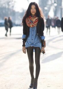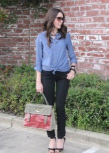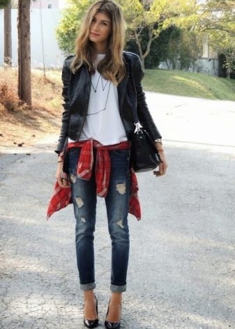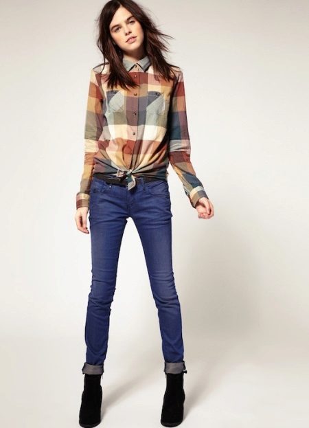 A restrained and stylish combination will be a plaid shirt of various warm colors, tied at the waist, combined with skinny jeans in blue. The outfit turns out to be stylish, but not provocative, which makes it functional in relation to many life situations. Stylish suede ankle boots of black color will complement the look, and as outerwear you can pick up a leather jacket, leather jacket, matching the shoe.