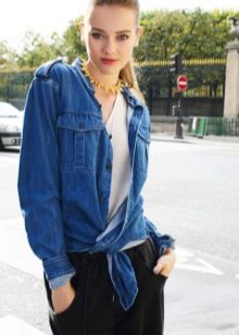 There is a variant of combining a tied shirt with a T-shirt worn under it. This method is suitable for girls who have flaws in the figure and want to hide them. You can put the shirt on top of the shirt and tie it either on the belt or at the waist, depending on personal preference. Due to the presence of shirts underneath, the buttons of the shirt can be left unfastened.